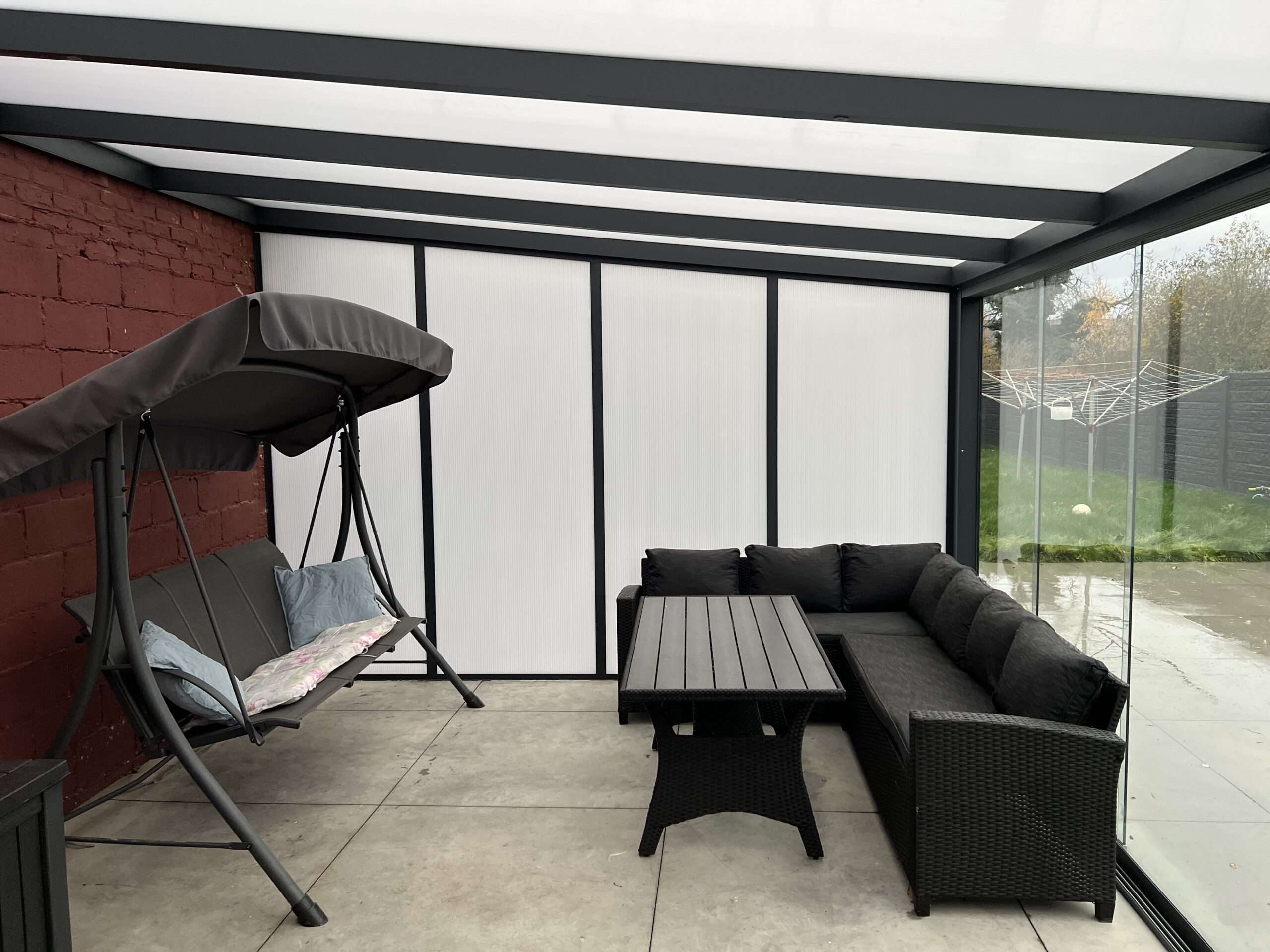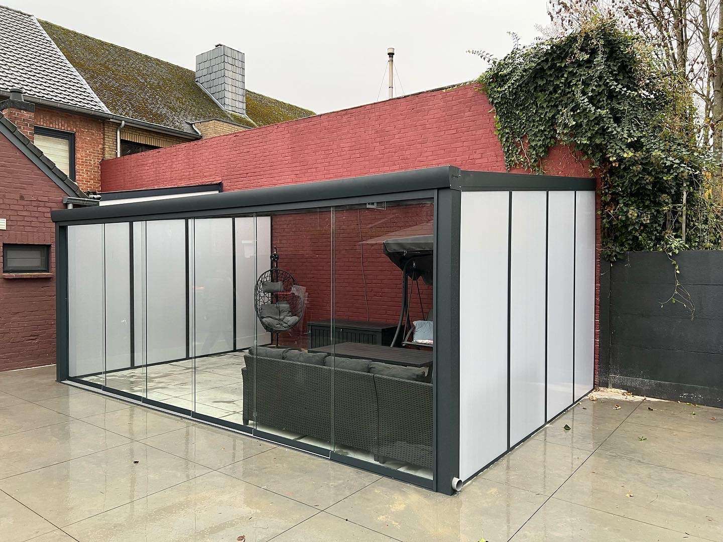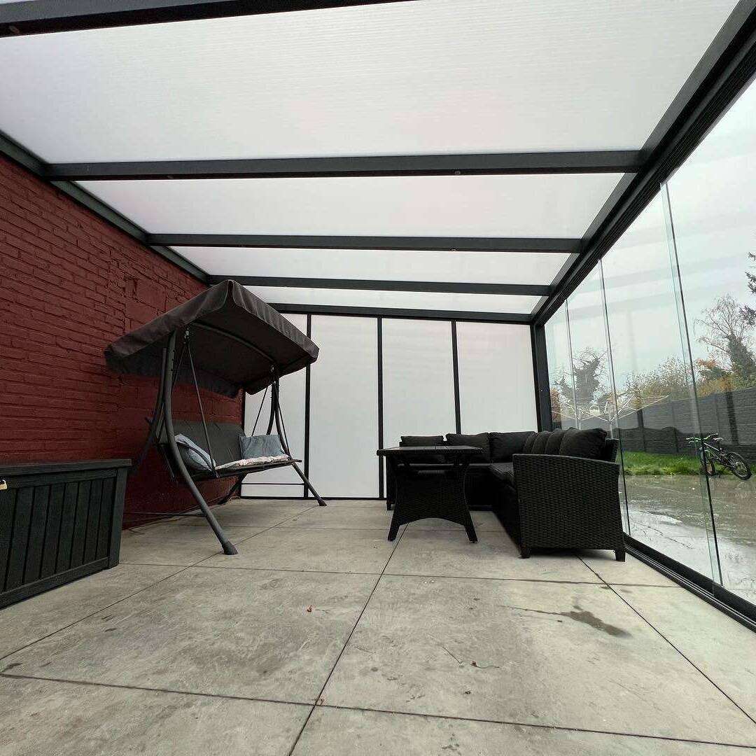 In Heusden-Zolder hebben we een veranda geplaatst met schuifdeuren van polycarbonaat, waardoor er minder ruimte wordt ingenomen. Op die manier kunnen onze klanten hun veranda optimaal inrichten en benutten. Aan de zijkanten en op het dak zijn er polycarbonaat kanaalplaten geplaatst. De klant heeft voor antraciete aluminium randen gekozen voor een moderne look en dat allemaal vanaf €5.000 tot €9.000.